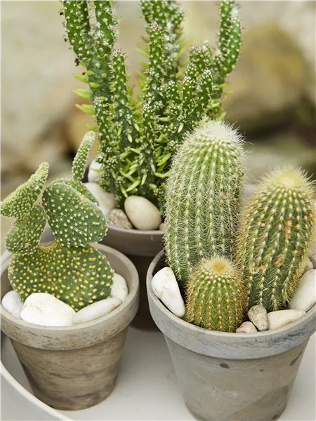 Weniger ist mehr! − wie der Begriff schon sagt, benötigen die trocken- und hitzeresistente Sukkulenten einen sonnigen und luftigen Standort. Bei der Wasser- und Düngergabe ist darauf zu achten, das in der sommerlichen Wachstumsphase nur mäßig gegossen bzw. gedüngt wird. Im Winter findet die sogenannte Trockenruhe statt, bei der die Pflanzen noch weniger Beachtung benötigen. Ein Klassiker unter den pflegeleichten Pflanzen sind Kakteen (Cactaceae). Sie sind echte Urgesteine, zäh und doch so vielfältig in ihren auffälligen Formen und Blüten. Die Pflanzen stehen gerne hell und kommen sehr gut mit voller Sonneneinstrahlung zurecht.