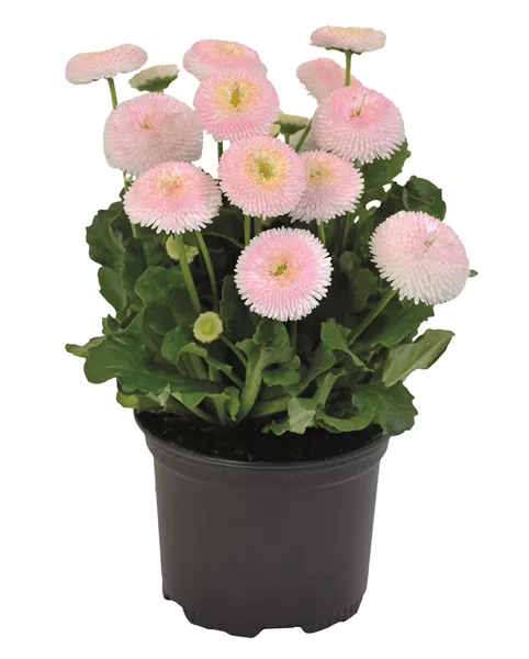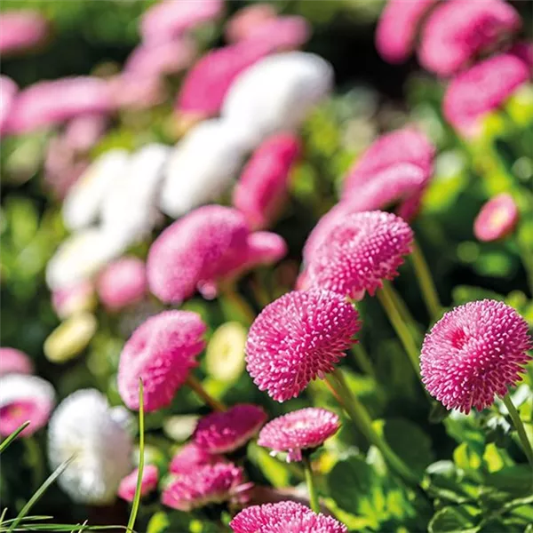 Das hübsche Tausendschön (Bellis perennis) wird auch Gänseblümchen oder Maiküsschen genannt. Ihr Vorfahre ist das Gänseblümchen, das auf unseren Wiesen und Rasenflächen wächst. Der farbenfrohe Frühlingsblüher mit seinen fröhlichen Pompon-Blüten sorgt für Heiterkeit in Ihrer Umgebung. Mit seiner langen Blütezeit bis Juni zeigt er seine gefüllten oder ungefüllten Blütenbälle an bis zu 20 cm hohen Stielen. Diese können rosafarben, rot, weiß oder auch zweifarbig sein.